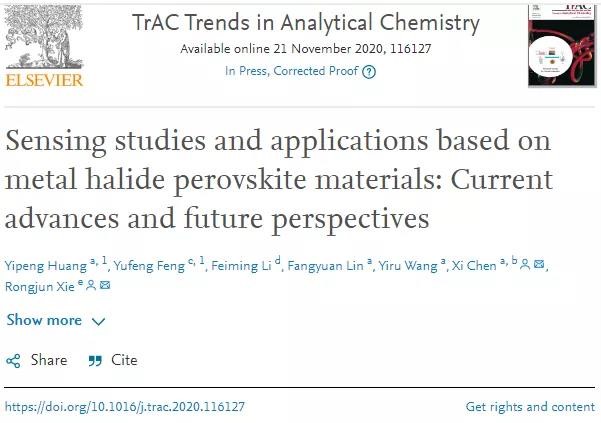 Yipeng Huang, YufengFeng, Feiming Li, Fangyuan Lin, Yiru Wang, Xi Chen, Rongjun Xie. Sensing studiesand applications based on metal halide perovskite materials: Current advancesand future perspectives. Trends in Analytical Chemistry, DOI: 10.1016/j.trac.2020.116127.