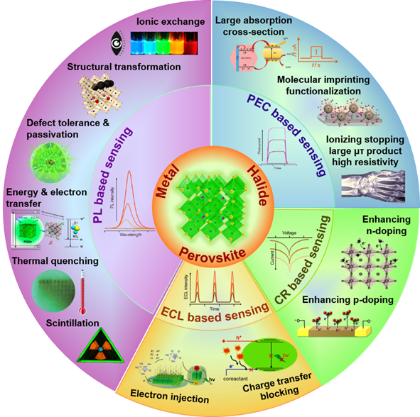 图1.MHPs在PL, PEC, ECL和CR方面的传感应用示意图