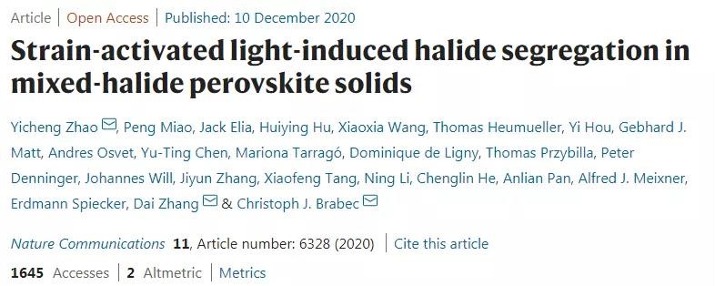 参考文献 Zhao, Y., Miao, P., Elia, J. et al. Strain-activated light-induced halide segregation in mixed-halide perovskite solids, Nature Commun 2020, 11, 6328 DOI: 10.1038/s41467-020-20066-7