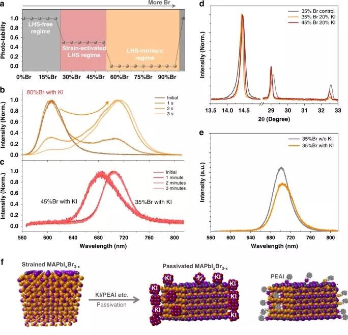 在35 % Br/45 % Br含量的多晶薄膜中,通过KI等添加剂、或者沉积在合适的基底(SiO2上),应力导致的偏析现象能够得以消除。