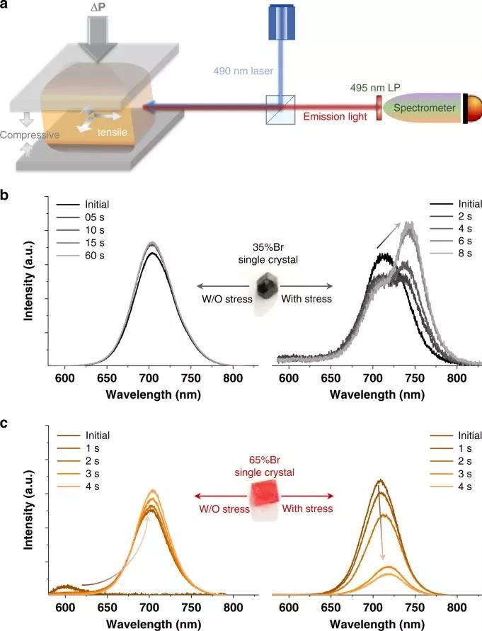 单晶状态的CH3NH3Pb(I0.65Br0.35)3(35 % Br)在无外加单轴压力的条件中没有发生偏析现象,仅仅当施加单轴应力的时候才能发生偏析现象。此外,生长在晶格不匹配的基底(比如CaF2)上,由于不均匀分布的应变,会导致不均匀偏析现象。
