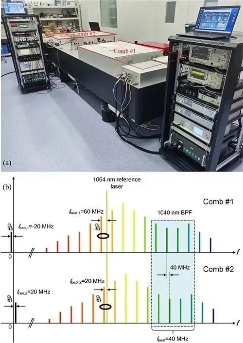 图1 (a)高功率光纤光梳工程化原理样机照片,(b)高功率光学频率梳环外频率稳定度测量原理图