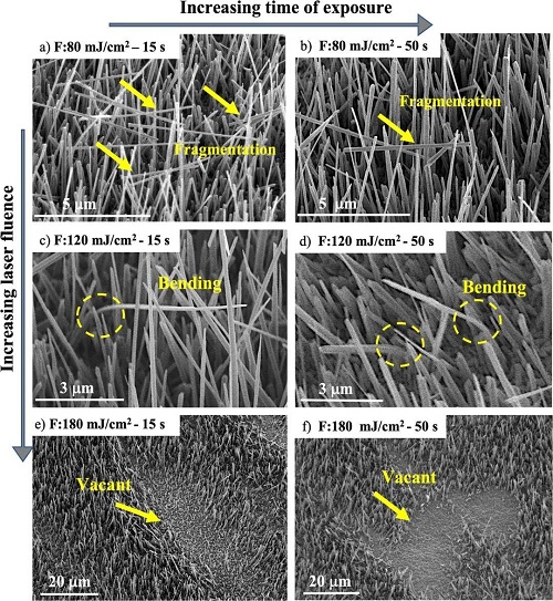 图 2.在a)80 mJ/cm2下15秒、b) 80 mJ/cm2下50秒、c) 120 mJ/cm2下15秒、d)120 mJ/cm2下50秒、e) 180 mJ/cm2下15秒和f) 180 mJ/cm2下50秒激光加工后氧化铜纳米线的扫描电镜图像。