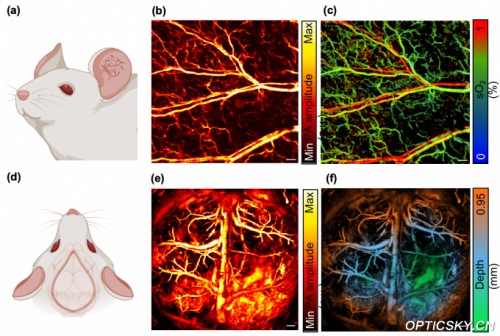 团队通过大量的活体实验,证明了MW-OR-PAM可实现高分辨率活体血管成像、血氧饱和度成像、经颅脑成像。MW-OR-PAM从绿光到红光的一体化谱段覆盖,兼顾结构-功能双重信息;MHz 级重频与亚微秒切换,有望让高速生理动态过程(血流/代谢/神经耦合)捕获更可靠;单泵源配合光纤SRS的方案与同轴探头设计,降低系统复杂度,利于复制与转化。