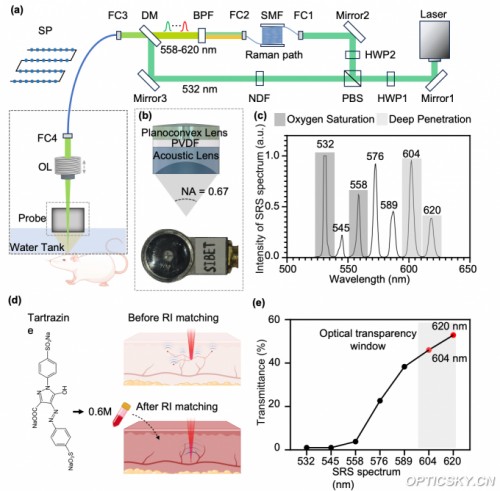 基于保偏光纤的受激拉曼散射(SRS),以一台 532 nm 纳秒激光器扩展至 532–620 nm 可调输出,用于血氧成像的波长切换 <1 μs(亚微秒级),重频上限达MHz,覆盖高速活体成像需求。以通用绿光泵浦替代多台专用多谱段激光器,显著降低成本。(2)研制高灵敏度光声探头,以P(VDF-TrFE) 薄膜与光学透镜同轴布局,实现光激发/光声探测共轴,光声探头数值孔径达到0.67,带宽 98.94%,光学透过率高达90%,在保持高分辨率的同时显著提升灵敏度与频谱覆盖,兼顾对比度与定量稳定性。(3)引入生物兼容组织透明化染料柠檬黄(Tartrazine),在 ≥600 nm 波段实现活体可逆透明化,定向提升红光通道的信噪比与有效成像深度,补齐多光谱血氧定量的“短板”。