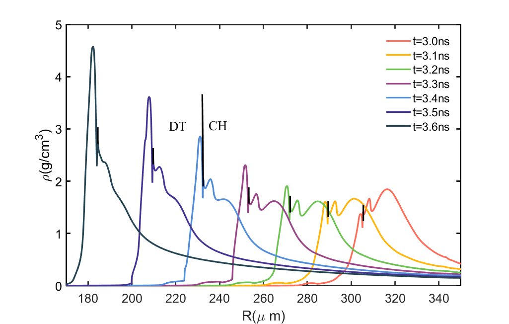 在加速阶段内爆开始之前,燃料-烧蚀层界面已经获得了由反射的扰动稀疏波诱发产生的扰动种子。在靶设计中,密度分布在内爆过程中可能会发生显著变化。在初始阶段,燃料-烧蚀层界面外部的密度大于其内部的密度,不满足RTI发生的条件。然而,在加速阶段内爆的后期,燃料密度可能高于烧蚀层密度,从而导致不稳定的燃料-烧蚀层界面,满足类经典RTI发生的条件。图3给出了当前靶设计内爆过程中典型时刻密度剖面,证实了当前的理论预测。