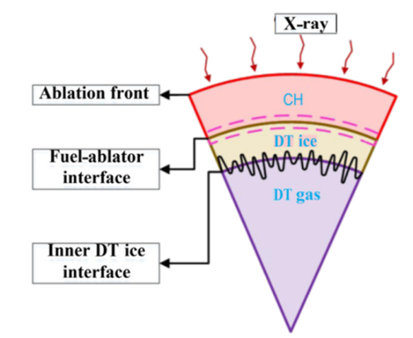 流体力学不稳定性在激光驱动惯性约束聚变(ICF)内爆过程中起着至关重要的作用。间接驱动内爆靶丸主要存在三个界面,如图1示意图所示。其中燃料-烧蚀层界面由类经典瑞利泰勒不稳定性(RTI)主导,没有显著的烧蚀致稳效应,其不受控发展是导致烧蚀材料混入热斑的主导因素。