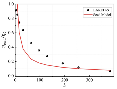 为了验证上述所发展模型的置信度,我们基于LARED-S程序开展了不同模数的数值模拟。由馈出过程诱导的扰动幅度与内DT冰界面初始扰动幅度之比,连同提出的种子模型,如图2所示。所提出的模型与数值结果之间大致吻合,这表明我们的理论分析抓住了影响燃料-烧蚀层界面的主导因素。然而,提出的种子模型与数值结果之间存在一定的差异,这源于理论分析尚未考虑可压缩性、球几何、辐射输运和真实状态方程等复杂因素。