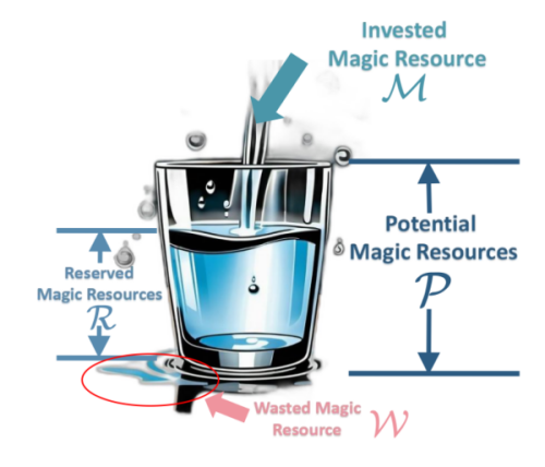 示意图:采用倒水入杯模型类比展示“注入魔术资源”、“潜在魔术资源”与“存留魔术资源”之间的关系