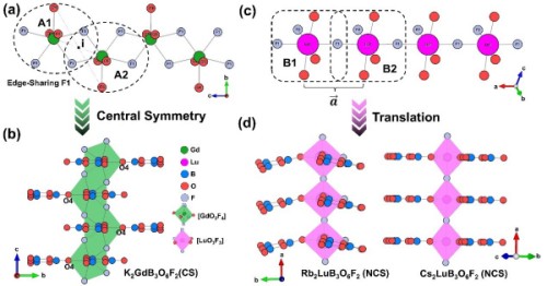 中国科学院新疆理化技术研究所科研团队在协同优化策略的指导下,合成了三种新型稀土金属硼酸盐氟化物,K2GdB3O6F2、Rb2LuB3O6F2和Cs2LuB3O6F2。实验表明,这三种化合物都表现出小于200nm的短截止边,其中Cs2LuB3O6F2表现出1.5倍于KH2PO4的实验倍频效应。计算显示,Rb2LuB3O6F2和Cs2LuB3O6F2有潜力通过Nd:YAG激光器的五次谐波产生过程,直接输出213nm的相干光。更重要的是,三种化合物的结构演化表明,稀土金属多面体配位严重影响[B3O6]基团的排列和取向,对结构最终的对称性起着决定性作用。
