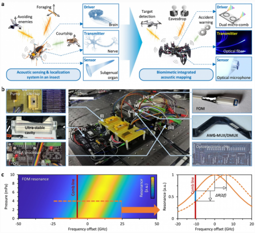 在发表于eLight的研究论文中,电子科技大学与上海交通大学、中国科学院动物研究所、中国电子科技集团智能院合作,提出一种基于昆虫听觉仿生原理的声学分析装置,采用全锁定光学频率双梳,驱动超过100个光纤声学探头,开创性地实现了对自由空间发声目标的nPa级高灵敏探测、cm级高精度定位和优于99%的高准确识别,并实现了在仿生机器人上的灵活部署,在无人机被动侦测等应用中展现了优异性能。信息与通信工程学院博士生何欣玥、常冰、谭腾副教授、周恒教授和上海交通大学郭旭涵教授为论文共同第一作者,电子科技大学姚佰承教授为论文唯一通讯作者。该论文入选eLight当期封面论文。