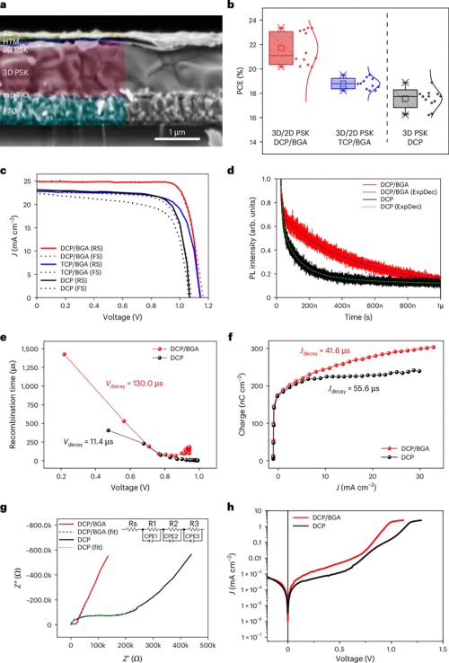 图 3:二维钙钛矿覆盖层对钙钛矿太阳能电池(PSCs)性能和电荷动力学的影响分析。
