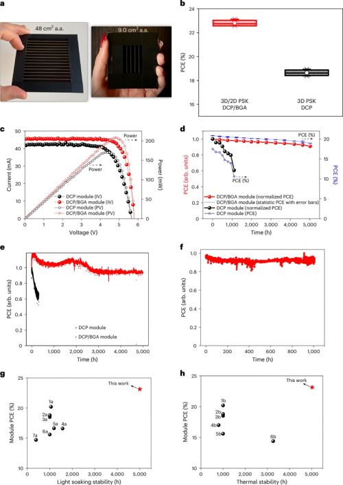 通过该共晶界面层,小面积钙钛矿太阳能电池实现了23.4%的功率转换效率。在模块层面,活性面积为9.0 cm²和48 cm²的钙钛矿太阳能模块分别实现了23.1%和18.5%的效率,输出功率最高可达886 mW。该共晶结构显著提升了器件的长期稳定性:在最大功率点连续1太阳光照>5000小时后仍保持95%以上的初始效率;紫外光照射>1000小时后效率保持率超过98%;在85°C高温连续热应力下>5000小时后效率保持率高于91%。